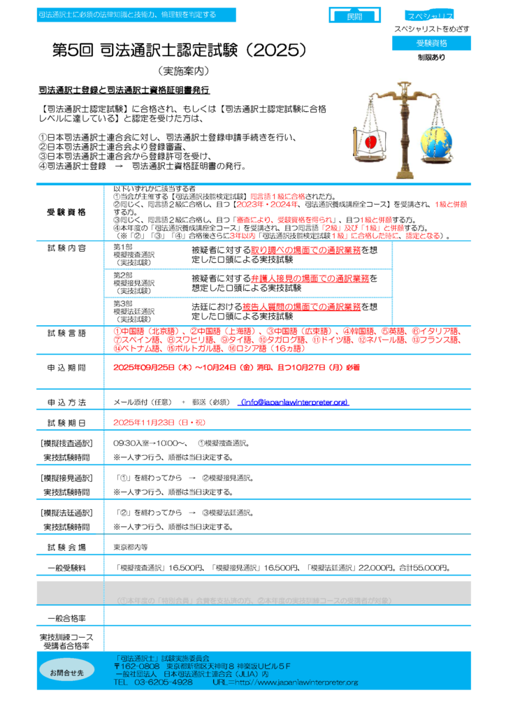 第5回 司法通訳士認定試験の受験申込を開始いたしました。
