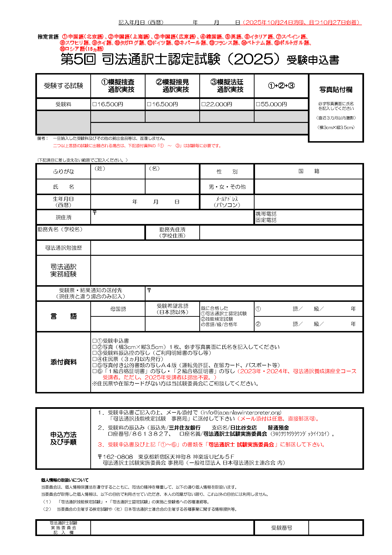 第5回 司法通訳士認定試験の受験申込を開始いたしました。